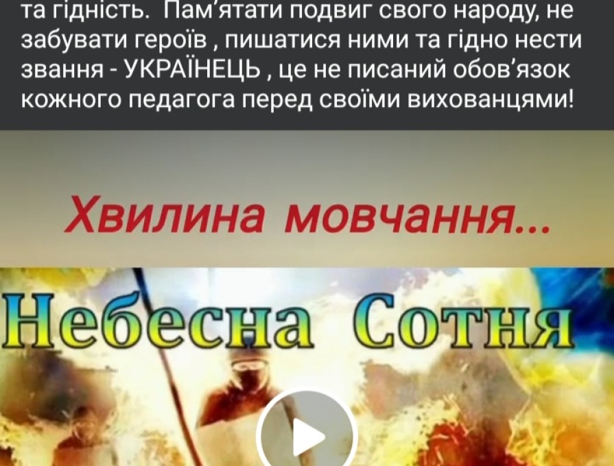 20 лютого 2024 року - десята річниця вшанування пам'яті Героїв Небесної Сотні. Людей, які загинули у боротьбі за ідеали демократії та європейське майбутнє. Ця дата стала символом незламної волі українського народу, його готовності боротися за свої права та гідність. Памʼятати подвиг свого народу, не забувати героїв , пишатися ними та гідно нести звання - УКРАЇНЕЦЬ , це не писаний обовʼязок кожного педагога перед своїми вихованцями!
